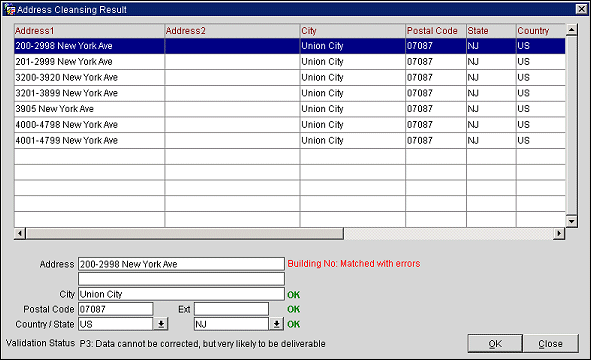 The Address Cleansing Result screen displays all entries in the AddressDoctor database that match, or nearly match, the address information you entered. Results are displayed in order, from most likely to least likely matches.