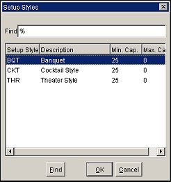 Setup. Indicates the Setup Style Code selected for this function space. For catering packages not configured as Bookable via Web Site, selecting the down arrow or F9 in this field will allow the user to select a single setup style. For catering packages configured as Bookable via Web Site, selecting the down arrow or F9 in this field will allow the user to select multiple setup styles. When multiple setup styles have been selected, the grid cell will be highlighted in yellow. See Assign Function Space Setup Styles below.