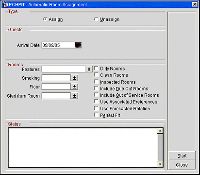 Use this screen to automatically assign room numbers to individual reservations or to your group reservations and PM. With the Room Assign function you can block all reservations for specific arrival dates, room types, room feature preferences, or smoking requests. Reservations for the block or group must have been made prior to using this option. Once Auto Room Assignment has been completed, the group check-in can be done.