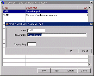 Code. Enter the code that will identify the reason for the cancellation. (When editing an existing block cancellation reason, you cannot modify the code.)