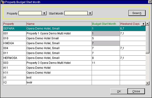 The Property Budget Start Month screen allows the user to change the Budget Start Month on the budget grid display, and to designate the Weekend Days for the specified property.