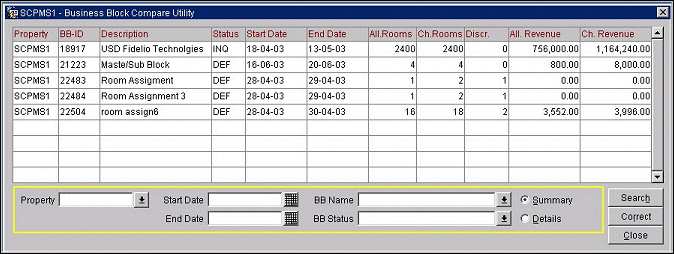 Summary/Detail. Select the Summary option button to see a one-line entry for each business block for which the grid room allotment and/or allotment revenue figures do not square with the change log. To see the detailed change log entries for a business block for which a discrepancy is found, type the business block ID into the BB Name field, select the Details option button and run Search again. Individual change log entries for that business block will be displayed.