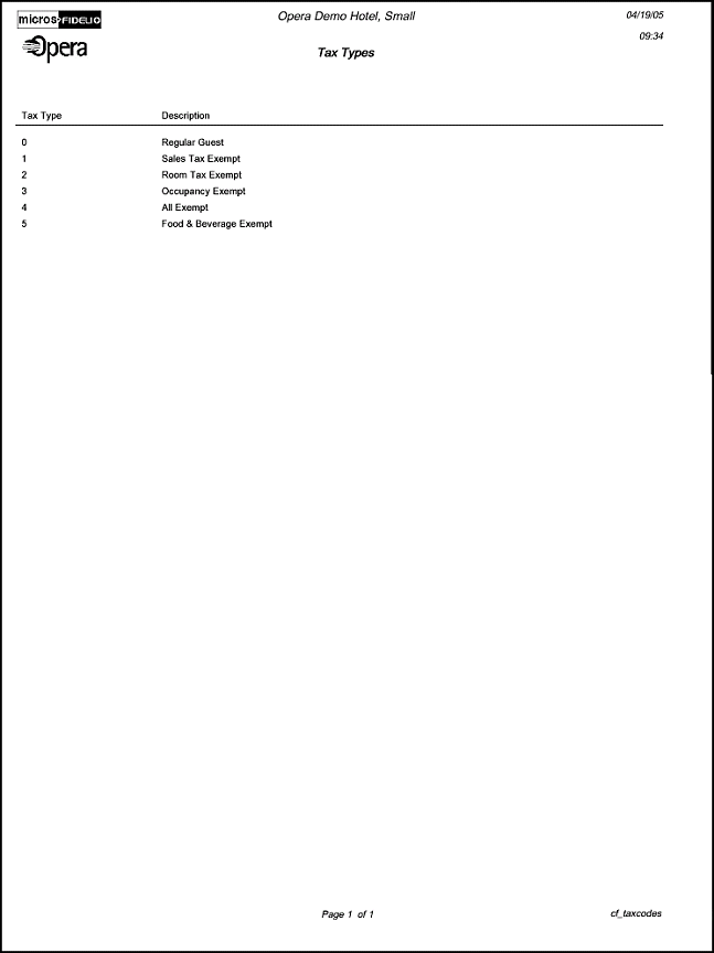 Reports Overview > Property Management System Reports Group > Configuration Reports Group > Configuration - Tax Codes (cf_taxcodes with GENREPPAR.FMX)