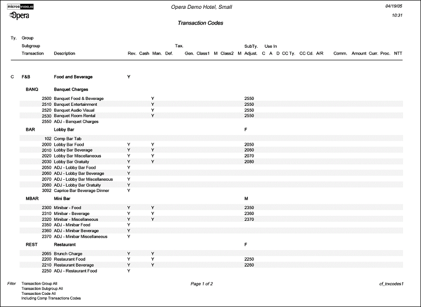 The Configuration report for Transaction Codes will display all Transaction Codes that have been configured in the application. The report information will be grouped by Transaction Group->Subgroup, and then all corresponding Transaction Codes.