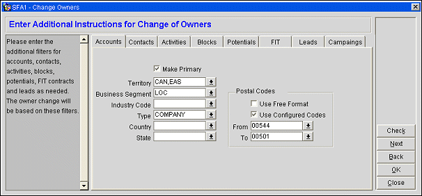 Change to Owner. Select the sales manager owner to whom the accounts, contacts, activities, bookings, etc. will be reassigned. The name of the owner you select appears in the To Owner Description field.