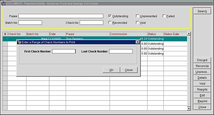 Note: To reprint a check that is statused Unpresented, you must first change the check status from Unpresented to Outstanding so that it appears on this screen.  See Payment Activity for details.