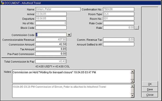 Note: Total Commission to Pay is shown in the currency of the bank associated with the travel agent or source. If the bank currency is different from the currency for the property, the computation of the commission at the exchange rate for the bank currency is shown beneath the Total Commission to Pay field.