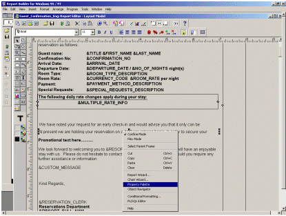 For customizable reports such as confirmation letters and guest folios, it is often necessary to include text or field items only under specific conditions. Running the Oracle Report Builder application from System Configuration>General>Report Setup, selecting your report, selecting Edit and Layout, offers the ability to use conditional formatting for an item using PL/SQL code.