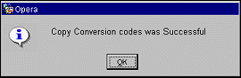 To select conversion codes for the new interface first, go to Interface Configuration > Conversion Codes. Select all conversion codes that will be applicable and activate them. Once done, exit and return to the Copy Conversions screen. You can select all tables at once or a few at a time to copy ORS conversion codes to the interface. It is suggested to do all at once for the initial installation. When you select to copy the conversion codes from the tables in OPERA, the following message will appear. Select OK.