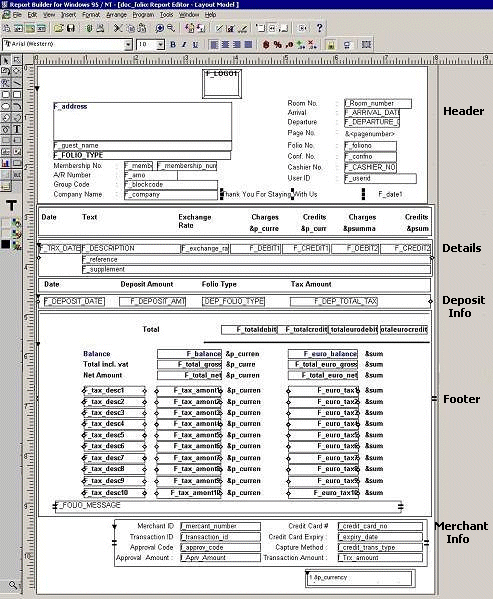 OPERA configuration allows an unlimited number of user-defined report formats to cover items such as guest folios, confirmation letters, registration cards, messages and accounting statements. While the content of these forms are defined using "merge codes," Oracle Developer 2000 Report Builder provides the formatting functionality. Definitions for each report are unique to that report and include such general items as the page size, margins and orientation, placement of page headers and footers, fonts, and number of copies. You have a lot of flexibility in how you set up these customizable reports. You can start new reports and design as you work or make use of OPERA's sample report templates to create customizable reports for your property.