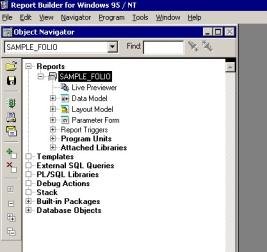 Starting the Oracle Report Builder program places you directly in the Object Navigator. This is the main starting point for creating your report. There are two main areas that you use to customize your report.