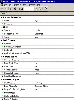 To find information pertaining to each of the above fields in the Property Palette, just select the field and select F1 and the help topic for that field in the Reports Builder will display and give all critical information for that field.
