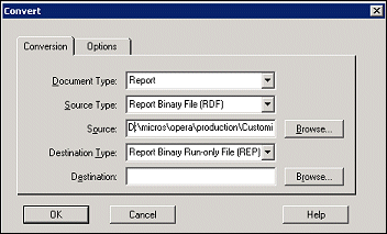 Select the Browse button to find the report RDF file you want to convert. With the file path for the RDF file shown in the Source field, select the OK button. The REP file will be created and stored by default in the Micros\OPERA\Customizable Reports folder.