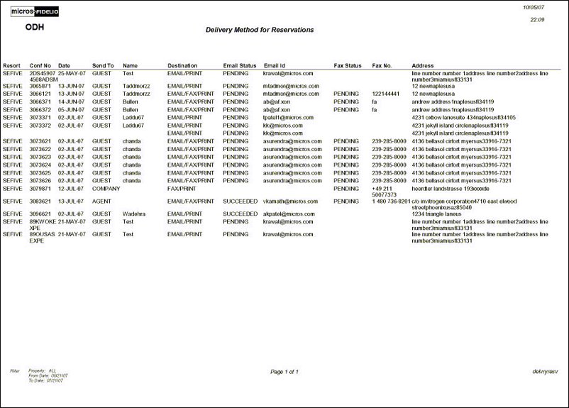This report identifies how a new reservation confirmation letter is being sent to the guest (by Email, Fax, or Printed/Mailed) and the status of the letter (Pending or Successful). Users can select a date range and properties within the CRO to view this information. Information in the report also includes the resort, reservation confirmation number, date the letter was sent, to whom it was sent (Individual guest or other type of guest or caller), name of the guest, and based on the destination type the corresponding email id, fax number, and mailing address will be displayed.