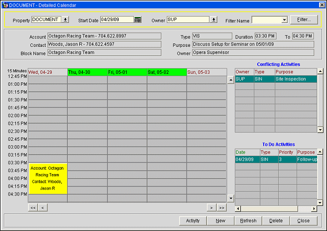 Double click on a Conflicting Activity item to display the Activities screen containing complete details.