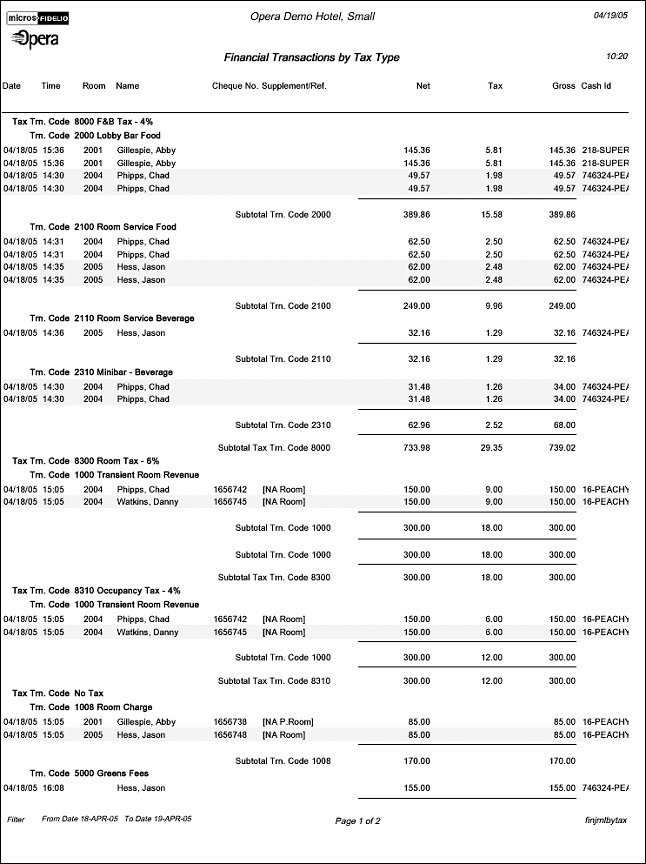 If you post an advanced bill for future days and the transaction is configured with exclusive tax the tax postings for all days will be posted with the current business date. However, the 'master/revenue' transactions will be posted for the days they will be consumed. This means the report output can have values in the ‘Tax’ Column, while the 'Net' and 'Gross' columns will be empty. The same would be true when the Transaction is displayed on the correct day, the Tax column will be empty since it was previously accounted for on the day the Advance Bill was run.