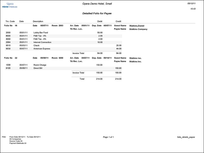 The Detailed Folio for Payee report displays all of the folios, per day, for reservations that are getting paid for by a 3rd Party Payee.