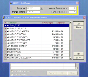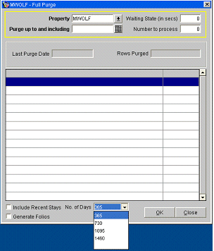 The purpose of the Full Purge utility is to provide a means for removing selected financial and data from the database when it is no longer needed. The Full Purge routine irrespective of the dates selected will not delete any reservations or associated records that have a departure date less than 2 years from the current business date.