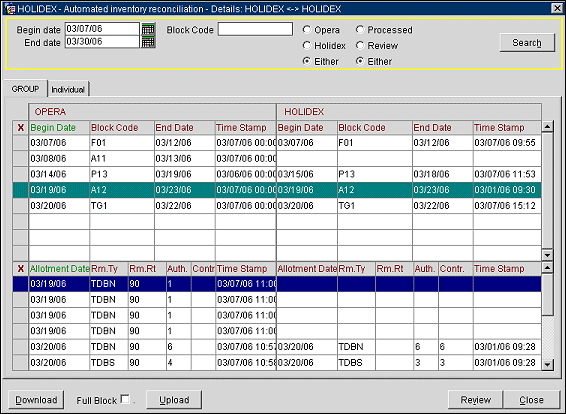In OPERA, any block that has a null value for the HOLIDEX original begin date and shows in AIB as not exchanged with the external systems, will be uploaded to (and the block will be created in) the system. The HOLIDEX original begin date will also be updated in the ALLOTMENT_HEADER table for the record in OPERA. (Available as of V4.0.4.02).