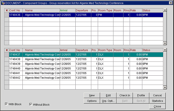 Once the group reservation has been completed, the reservation you have just created will appear in the top window of the Component Groups Module Group Reservation List screen. This screen can also be accessed from the Group Reservation Search screen (Reservations > Component Groups).