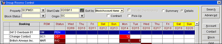 Day/Date. The rooms breakdown per day for this business block. For Master Allocations these fields will always display the number of rooms available. All other bookings will display the number of rooms booked; this includes Sub-Allocations.