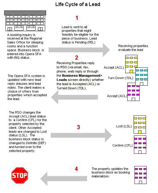 A booking is received in a Regional Sales Office with a request for sleeping rooms and / or meeting space for a property of the chain to which the RSO belongs. Or the customers could look for any available hotel of this chain in a certain geographical area or Destination. The RSO staff will enter the booking into their SFA system with an Inquiry status and generate new leads for all properties that fall into the criteria range that the customer has specified. Apart from destination, the request might be for certain property features, or for properties of a certain type.