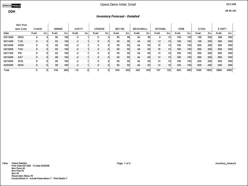 The Inventory Forecast report displays each Item with the number Available and Reserved for each date in the selected date range. This summary matrix grid allows the property to manage their inventory by displaying if the number of Items reserved exceeds the inventory. Additionally, the Inventory Forecast report can assist with the purchasing of Items prior to the Reservation or Block’s Arrival. The values displayed will match the 'Item Inventory' screen in the PMS application. This is accessed in PMS through F5>Item Inventory.