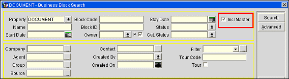 When searching for master Business Blocks and Sub Business Blocks using the Business Block Search screen, select the Incl Master check box adjacent to the search criteria fields.