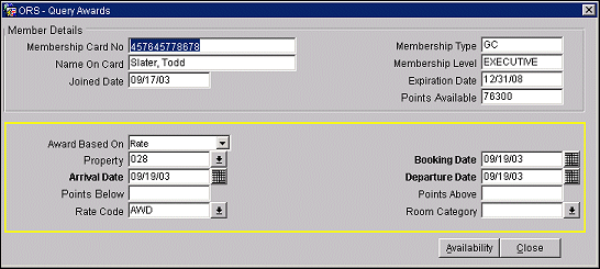 In the lower part of the screen you may enter information for use in querying for availability of redeeming points for awards. Information fields differ as noted, depending on whether you are redeeming points for a rate award, an upgrade award, a product award, or other (as indicated by the Award Based On selection you make).
