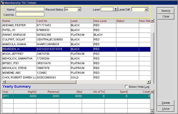 For each year the guest highlighted in the upper grid has been a member, the Yearly Summary grid shows the following information:
