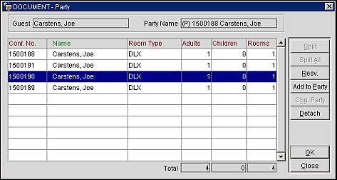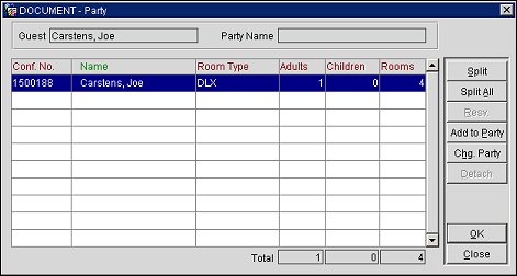 To split a multiple-room reservation into separate reservations for a party, select the Party option from the Reservation Options menu. (The Reservation Options menu is accessible from the Reservation screen or from the Reservation Search screen.) The Party screen appears with the currently selected reservation highlighted. The name on this reservation will be used to identify the party.