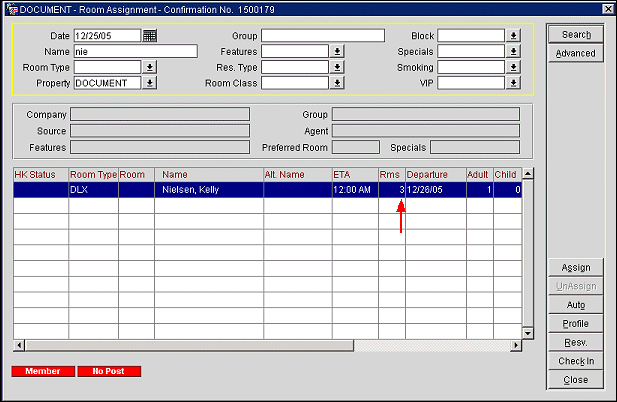 To assign rooms for a multiple-room reservation, select Front Desk>Room Assignment. The Room Assignment screen appears. Search for the reservation for which you want to block rooms. The Rms column of the search results grid shows the number of rooms on the reservation. As rooms are assigned, separate reservations are split off from the original reservation and rooms are subtracted from the total number reserved.