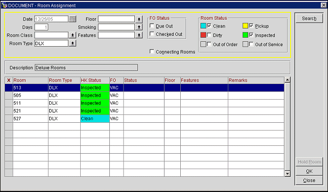 Search for and highlight the multiple-room reservation and select the Assign button. The Room Assignment screen changes to allow you to search for and select the room to be assigned for the reservation.