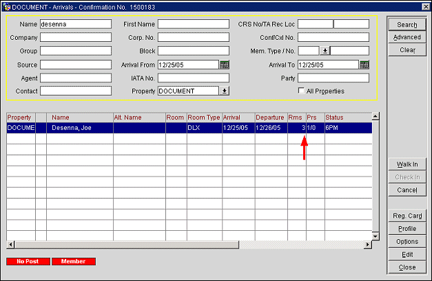 When you return to the Arrivals screen, the reservation is now shown with 1 room less in the Rms column.