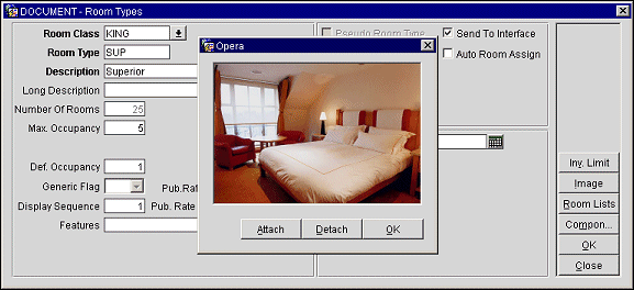 Once they have been configured, room type and room images are accessible from various places in OPERA. Pictures of rooms and room types can be displayed from the Available Room Search screen, Room Assignment screen, the Housekeeping Room Discrepancy screen, the Room Plan screen, the Floor Plan screen, the Rate Query screen and the Function Diary (when the OPS<version_number> Sales & Catering license is active). Along with the pictures are details about the room or room type.