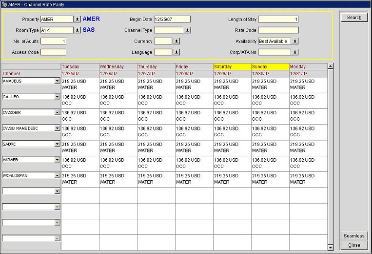 Seamless. Highlight a channel room/rate (a cell in the grid) and select the Seamless button to access the Seamless screen and view the detailed room/rate configuration. You can also access the Seamless screen by double-clicking in a cell with a channel rate/room combination.