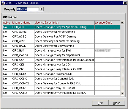 Business events for the external system are automatically enabled as soon as an OXI 2-Way license is activated. To access the license code from OPERA, go to the OPERA Configuration>Setup>License Codes>PMS>Add on License. To access the license code from OXI, go to Interface Configuration>License Codes. Below is a screenshot of the existing OXI licenses. Select your correct interface, enter the license code, and activate it.