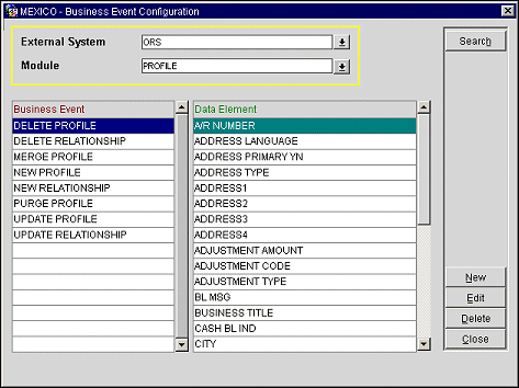 Example: Sample of data element selection within the business event NEW PROFILE.