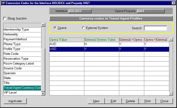 Example: In the example below we have linked the currency code USD to the external system value Y, which indicates the central commission payment for this interface. Holidex will always send Y and N. If you are using another interface, verify what values the external system will send, and configure the OXI TA currency code conversion table accordingly.