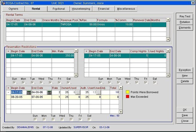 For the dates of 03/09/10 - 12/31/10, the Owner has been given 2 days of stay at a rate 1 and the Authorized Users have been given 28 days of stay at a Rate of 1. Now if the Owner has used the allotted 2 consumable points and they are booking a reservation, then a message will be displayed to the user that states, "Stay exceeds the max consumable points restrictions for Owners. There are 28 points left for Authorized Users. Do you want to override?" If the user selects Yes, then the number of points that the Owner is over their max consumption will be taken away from the Authorized Users maximum consumable points. So if that number is 2, then the Authorized Users total points is reduced down to 26.