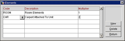 Select a unit element code and enter a multiplier for any elements associated with the rental. From the Elements screen, select the New button to add new elements, the Delete button to delete existing elements, and the Return button to return to the Rental tab.