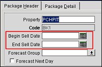 Available when the Rates > Package Pricing and Availability Attributes application parameter is set to Y and the Redemption check box is not selected on the Package Header, a Begin and End Sell Date Range can be defined on the Package Header. Defining a Sell Date Range on the Package Header enables a property to define a "selling season" for a package.