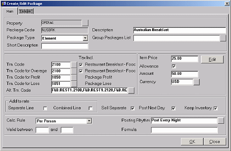 In this scenario the guest spent $24.00 for breakfast. The allowance was up to $50.00 but the item price was $25.00. OPERA posted a Package Profit of $1.00 in this case.