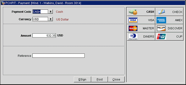 Payment Code. The payment method specified on the guest's reservation appears here by default. However, you can select a new payment method. Select the down arrow or press [F9] to choose another payment method from the list of values. Alternatively, you can type in the payment method description (or the first unique part of that description), or the payment method transaction code. The actual transaction code is displayed in the Payment Code field unless a Display Code has been configured, then it is displayed here (see Transaction Codes for details). An advantage of configuring Display Codes for transaction codes that are associated to a specific payment type, is that a payment method can be selected from the list of Payment Method buttons that are displayed on the right side of the Payment screen. These buttons will have logos on them (i.e., cash, check, credit card logos) once the transaction code has an associated credit card code defined and only specific major credit card logos (American Express, Visa, Master Card, JCB, Discover, Diners, UnionPay) are available.