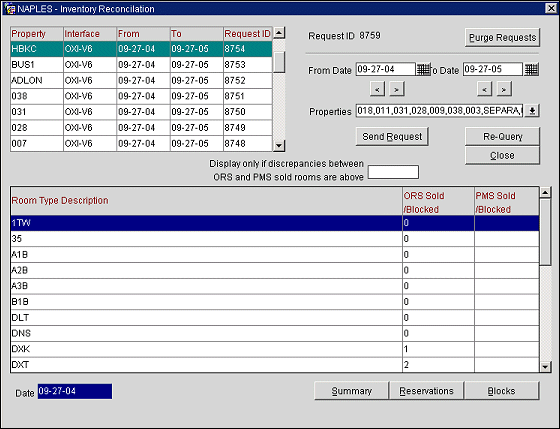 Blocks. Select this button to open the Inventory Reconciliation Allotment screen. This screen shows the detailed block sold rooms in ORS and PMS on the specified date. You can also have ORS send a block request to PMS.