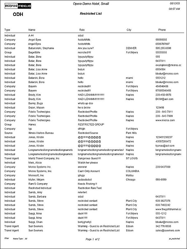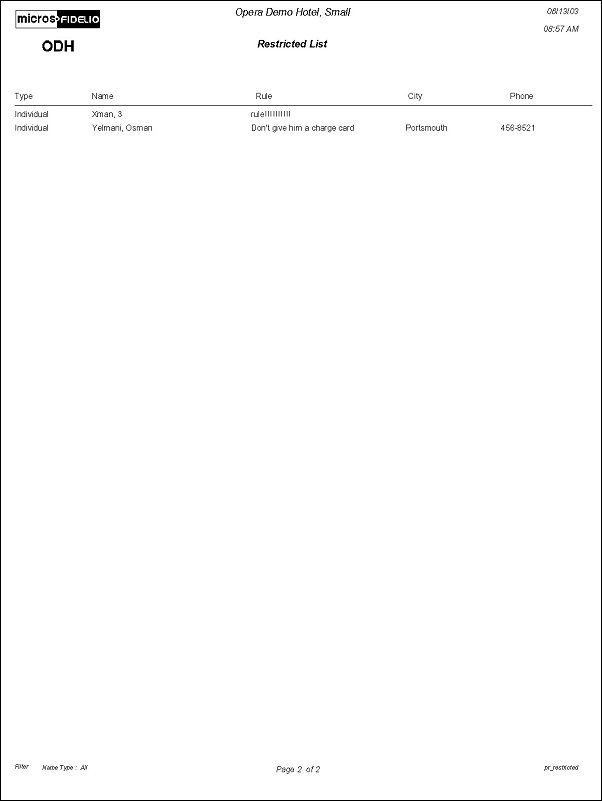 The Restricted List Report displays a list of all profiles that have been marked with a restricted status. Print this report for tracking profiles with these statuses to ensure reservation integrity.