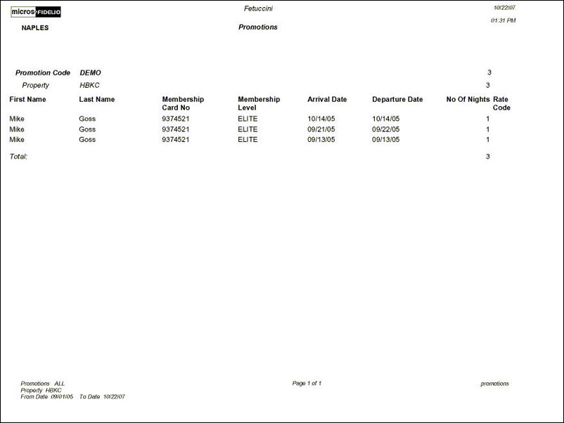 The Promotions Report identifies profiles registered for a particular Promotion Code. The report reads data from the Stay Records table and displays the promotion code, properties associated with the promotion code, member name registered for the promotion, member's card number, membership level, arrival and departure dates of the member's stay, number of nights, and the rate code associated with the stay.