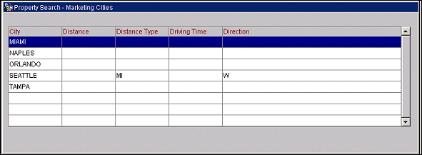 The Property Search - Cities screen appears when you select the City tab on the Sales Screen's Properties display. The Property Search - Cities screen provides a list of the marketing cities that are included in the region for the property that is currently highlighted on the Properties screen.