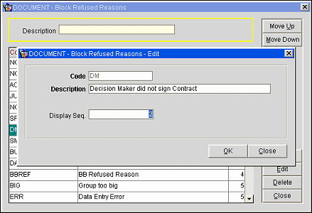 Code. Enter the code that will identify the reason for the refusal. (When editing an existing block refused reason, you cannot modify the code.)