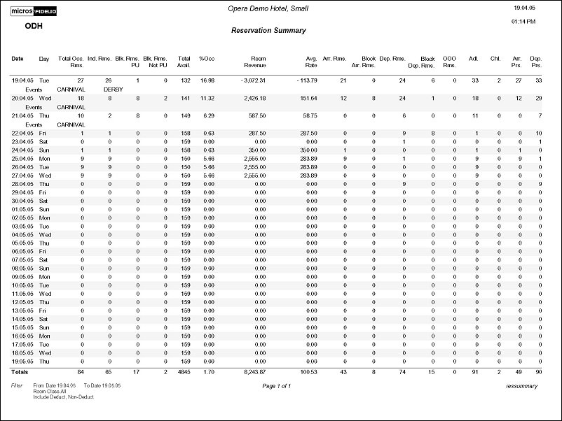 The Reservation Summary Report provides a summarized breakdown per day of all Reservation activity in the property. The Transient Rooms will reflect Total Deducted Reservations plus Total Non-deducted Reservations.